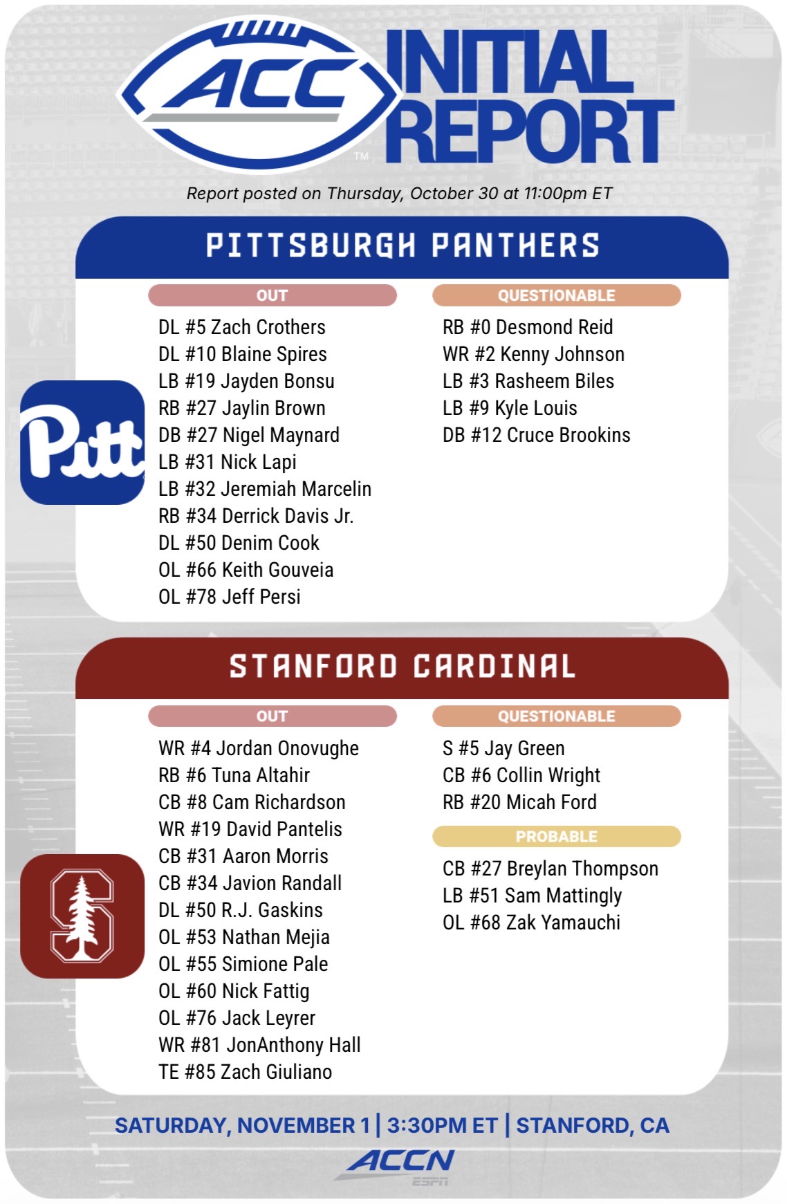 NCAAFOctober 31, 2025Pitt Panthers at Stanford Cardinal GameDay Preview